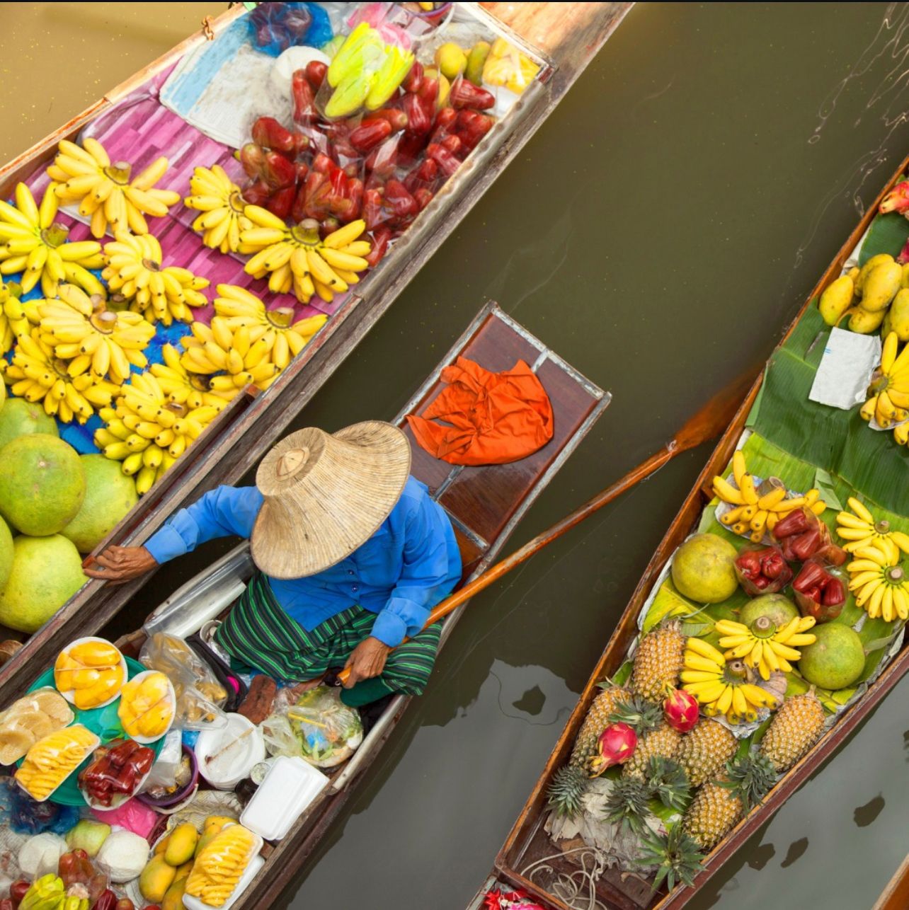 Immerse yourself in the thrilling energy of a Thailand floating market, where a maze of colorful boats drifts along lively canals, each overflowing with fresh tropical fruits, fragrant flowers, sizzling street food, and handcrafted treasures. The air hums with the animated calls of vendors beckoning you to sample their goods, the chatter of locals, and the intoxicating aroma of exotic spices and sweet delicacies. Paddle or glide through the bustling waterways, navigating past boats stacked high with vibrant produce and eye-catching souvenirs, while tasting unique snacks straight from the vendors’ hands.